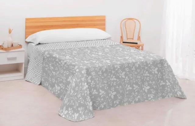 La colcha que aparece en la imagen es el modelo Daven, una colcha bouti reversible de la marca Innova Home. Se caracteriza por tener un diseño estampado floral en tonos grises y blancos por una cara y un diseño geométrico de espiga (zig-zag) por la otra.