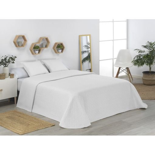 Esta es una colcha modelo IZANE BOUTI LISO de la marca INNOVA HOME, diseñada para su uso durante los meses de entretiempo. Se trata de una prenda ligera con un diseño liso y un acolchado termosellado que presenta un patrón geométrico moderno.