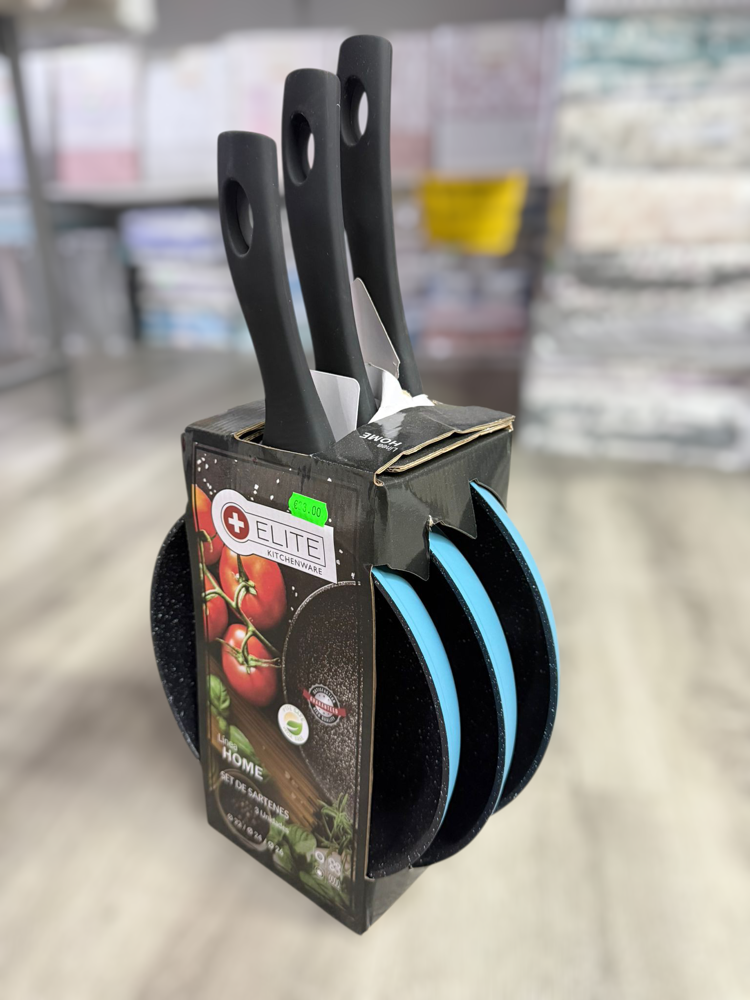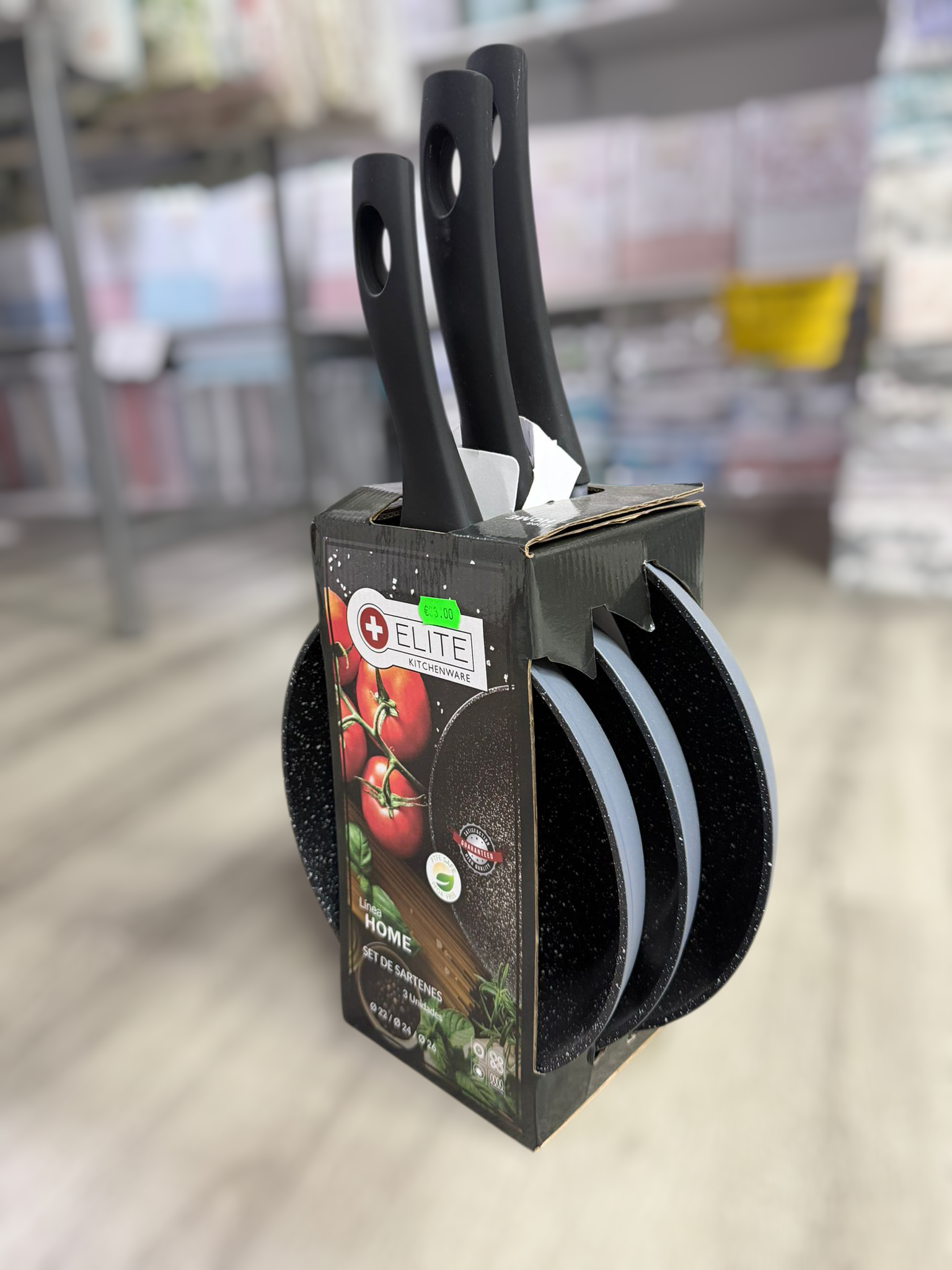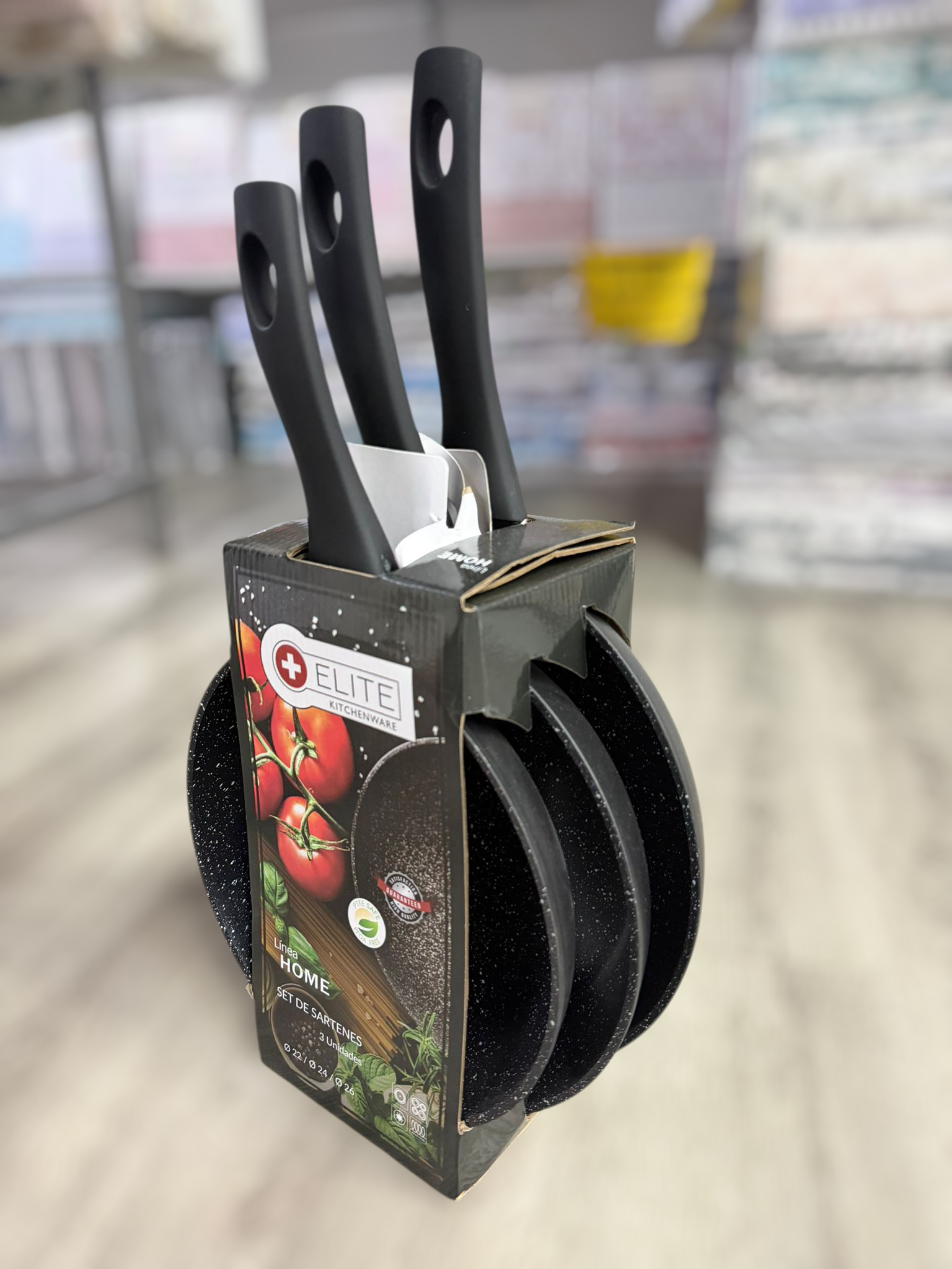 Este producto es un juego de 3 sartenes de la marca Elite Kitchenware. El set incluye típicamente tres tamaños diferentes para cubrir diversas necesidades en la cocina, siendo las medidas más comunes de 22cm, 24cm y 26cm de diámetro.