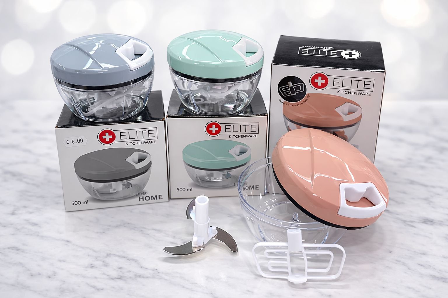 Esta picadora y mezcladora manual de 500 ml es un utensilio de cocina diseñado para picar verduras, frutas, frutos secos y carne sin necesidad de electricidad. Funciona mediante un mecanismo de cuerda manual (o cordón) que, al ser tirado, hace girar tres cuchillas de acero inoxidable situadas a diferentes alturas para un corte uniforme.