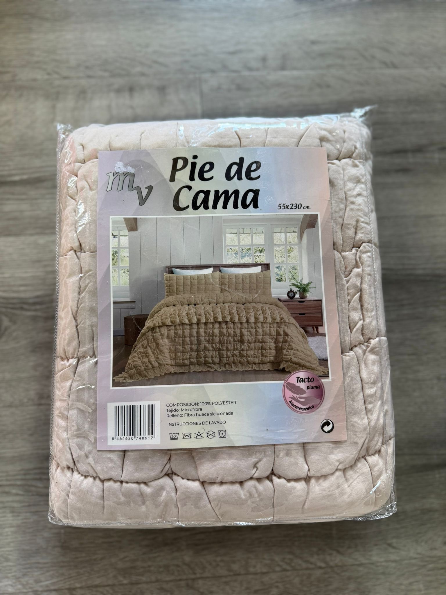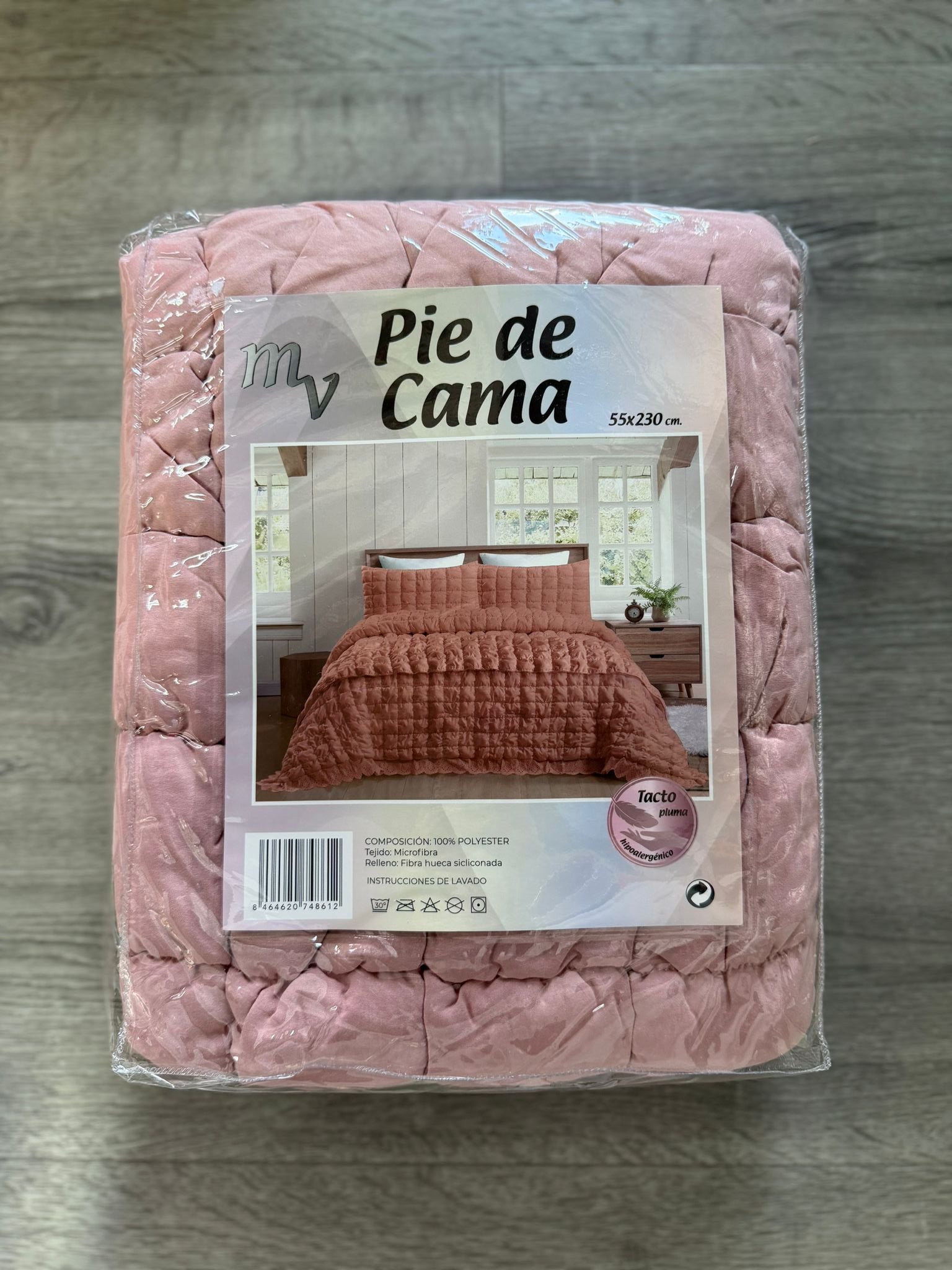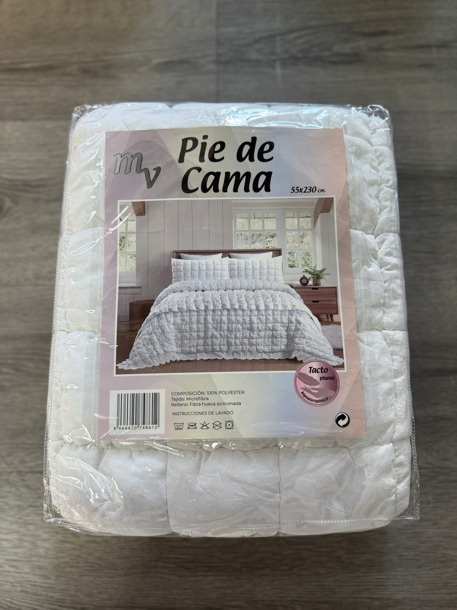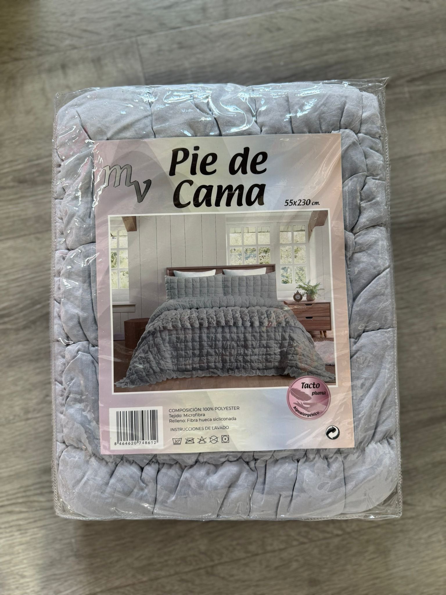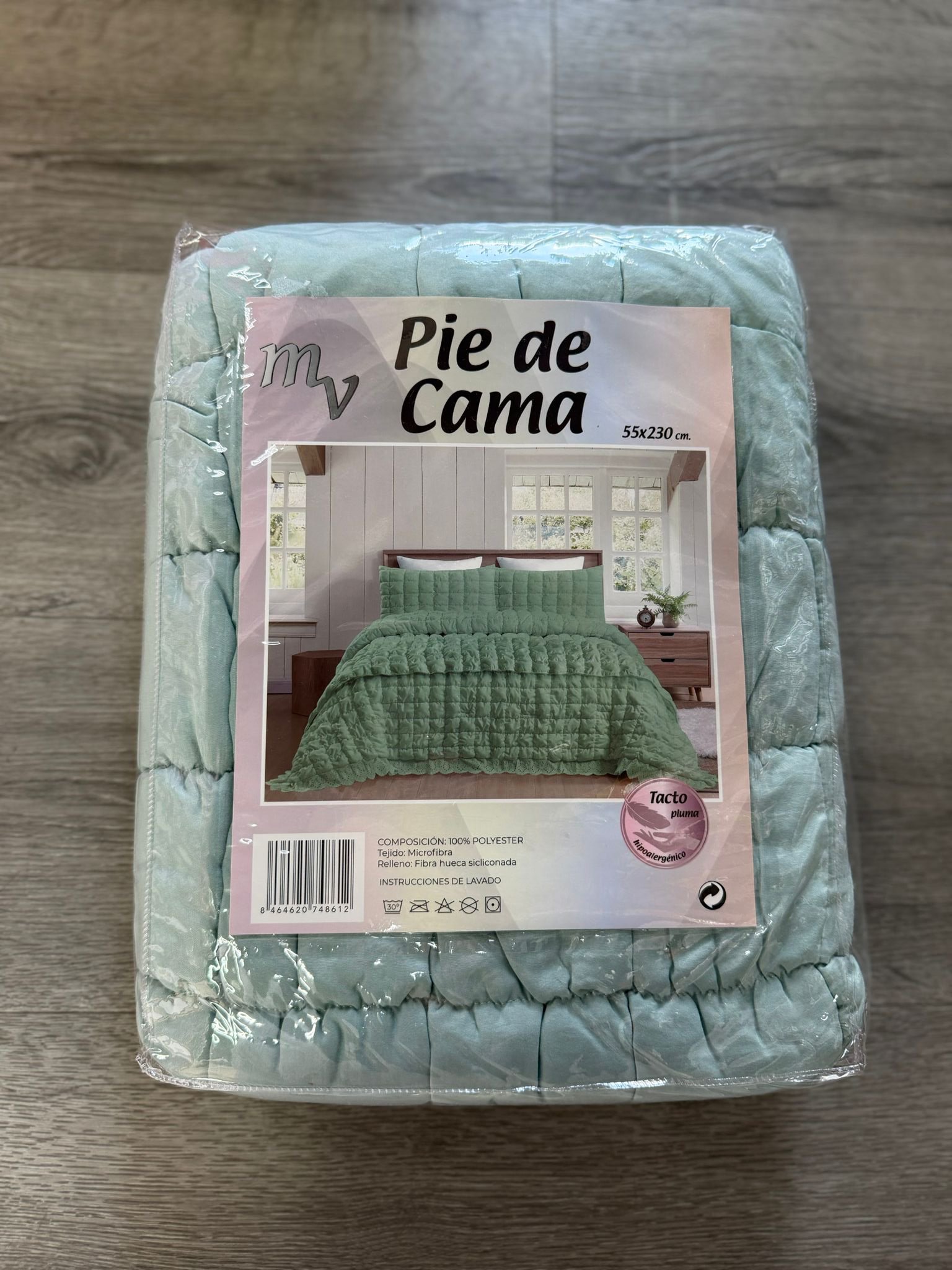 El producto en la imagen es un pie de cama de 55×230 cm, diseñado para decorar o abrigar la parte inferior de una cama, con un acabado acolchado y tacto suave de microfibra.